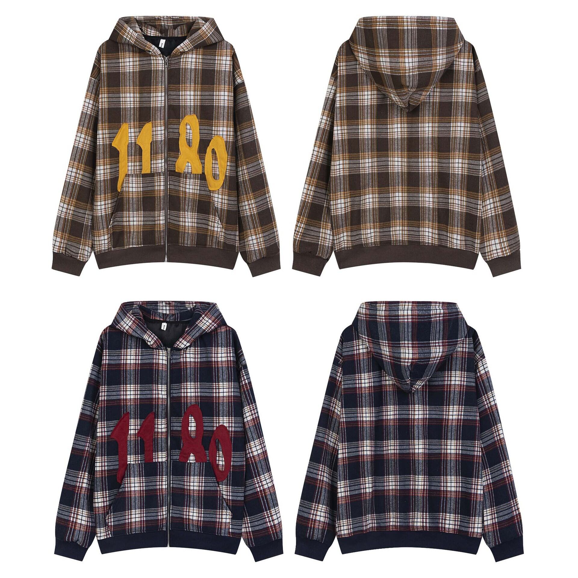 【商品名】チェック柄ジップアップパーカー ヴィンテージ風チェックパーカー 刺繍ナンバーデザインフルジップパーカー