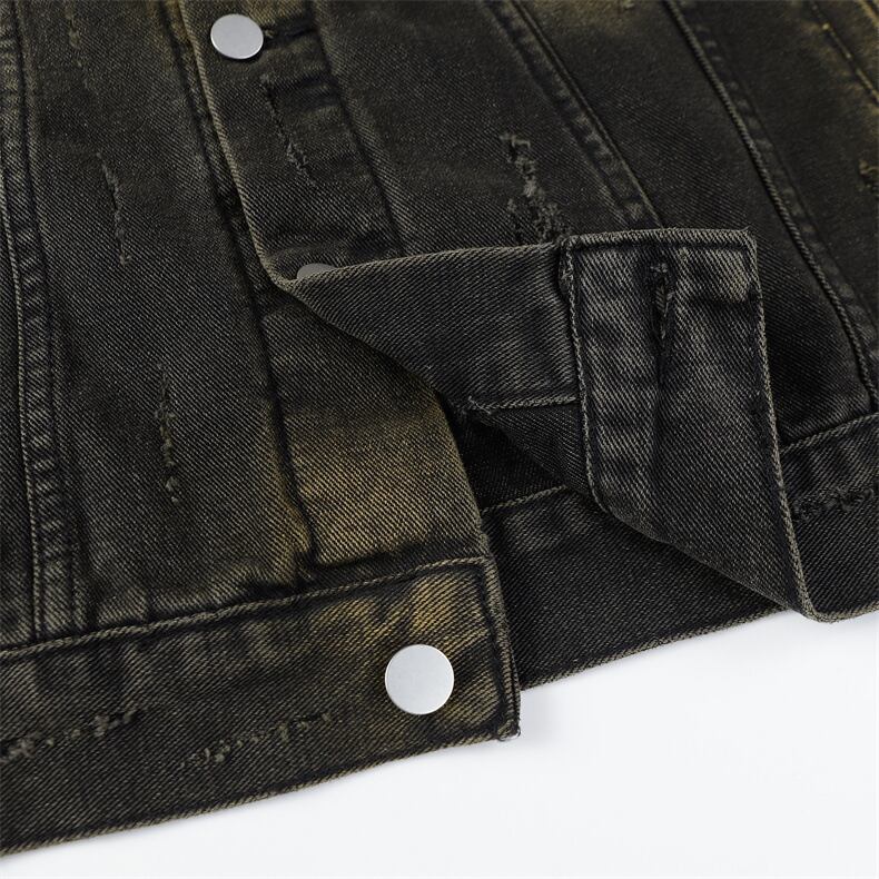 【商品名】ブラックウォッシュダメージデニムジャケット クラッシュ加工デニムジャケット グランジダメージデニムジャケット