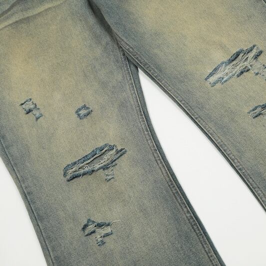 【商品名】クラッシュダメージデニムパンツ ヘビーリペアストレートデニム スラッシュクラッシュワイドジーンズ
