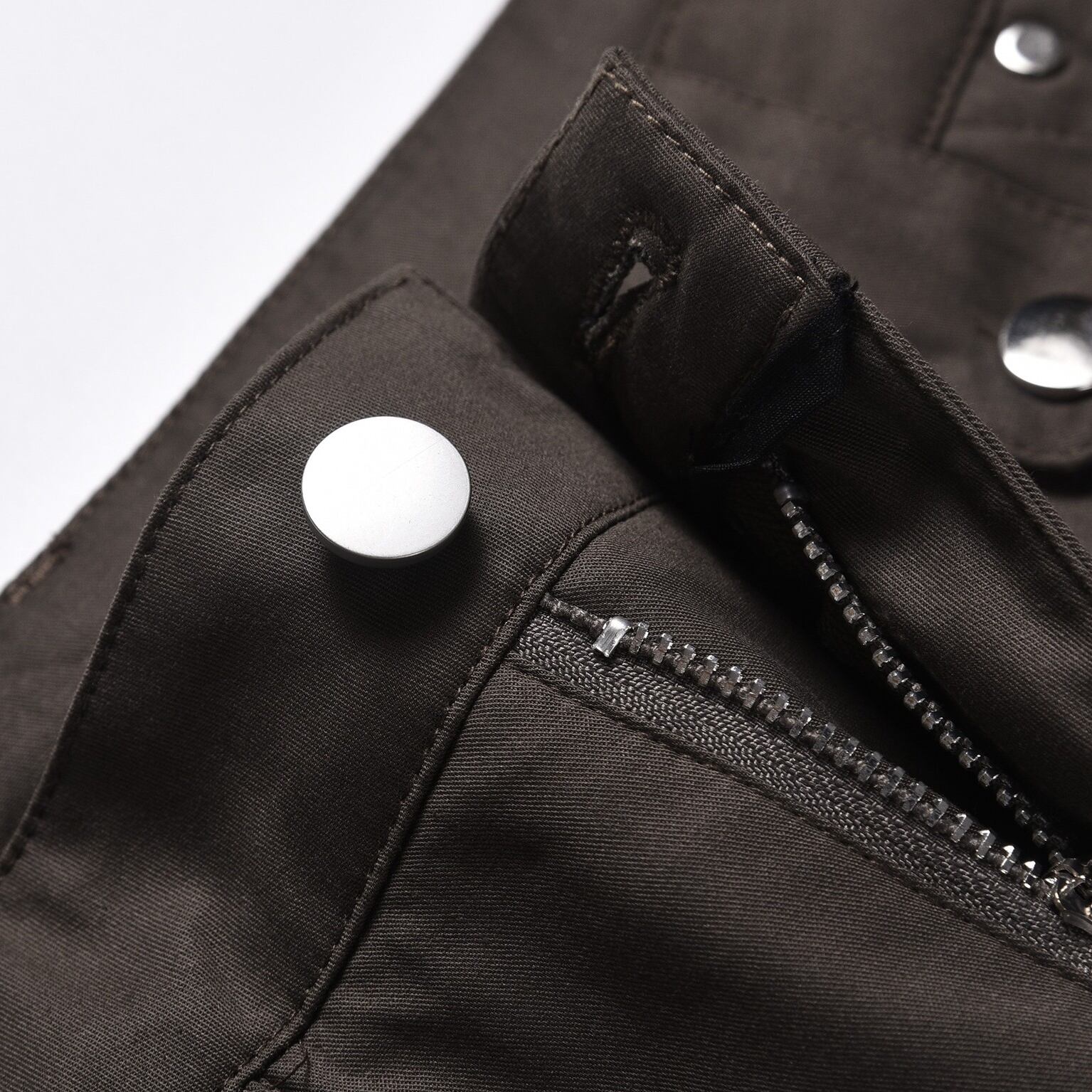 サイド、フロント、膝、裾…すべてのファスナーはデザインだけでなく、機能性も兼備。開閉によってシルエットに変化をつけたり、通気性を確保したりと、実用面でも活躍します。光沢感あるメタルのジップとベースのマットな生地のコントラストが、無骨かつ洗練された雰囲気を演出。ハイテックなギア感とユースカルチャーのテイストが絶妙にブレンドされた、まさに“攻めるボトムス”。