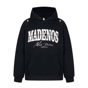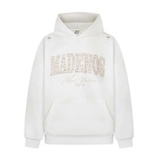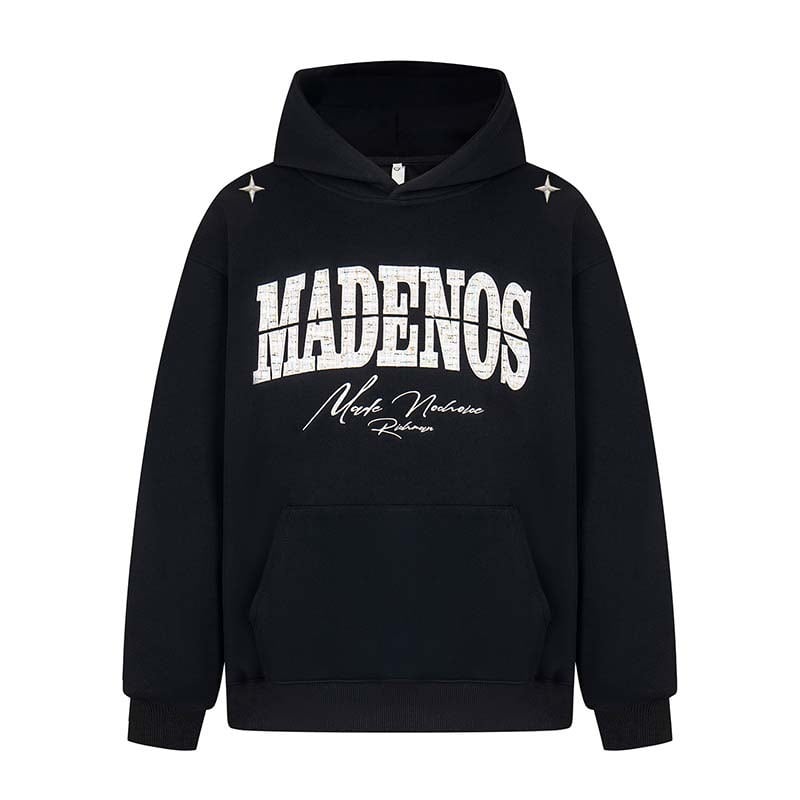 胸元に「MADE NOS」のビッグロゴを大胆に配置し、ラインストーンで煌びやかに仕上げたトレンド感満載のフーディー。シンプルなベースにリッチなアクセントを効かせたデザインで、ストリートでもクラブシーンでも存在感を放ちます。