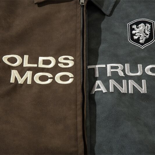 【商品名】ロゴ刺繍スタンドカラージャケット スエード調ジップアップジャケット ヴィンテージライクストリートジャケット