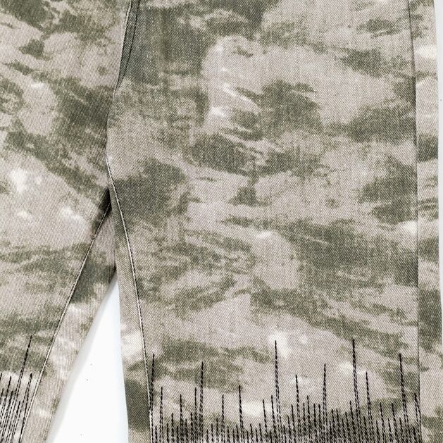 都会的な雰囲気を演出するカモフラージュ風プリントを施した個性派デニムパンツ。グレーを基調としたニュアンスカラーで仕上げており、ストリート感と高級感を兼ね備えたデザインです。シルエットはワイドかつストレートで、トレンドのゆる感をしっかり演出しつつも、脚長効果を意識したバランスの取れた一本となっています。ストリートコーデはもちろん、モード系や韓国ファッションとも相性抜群です。