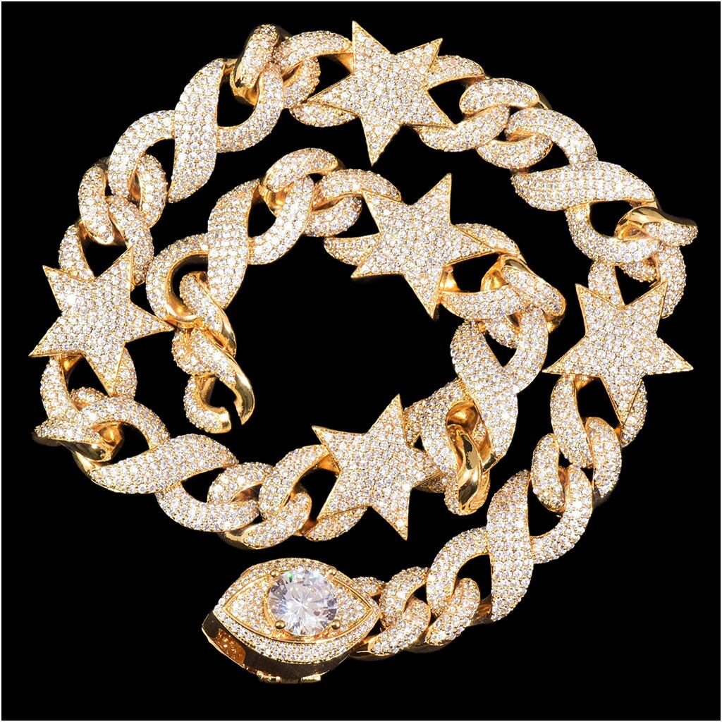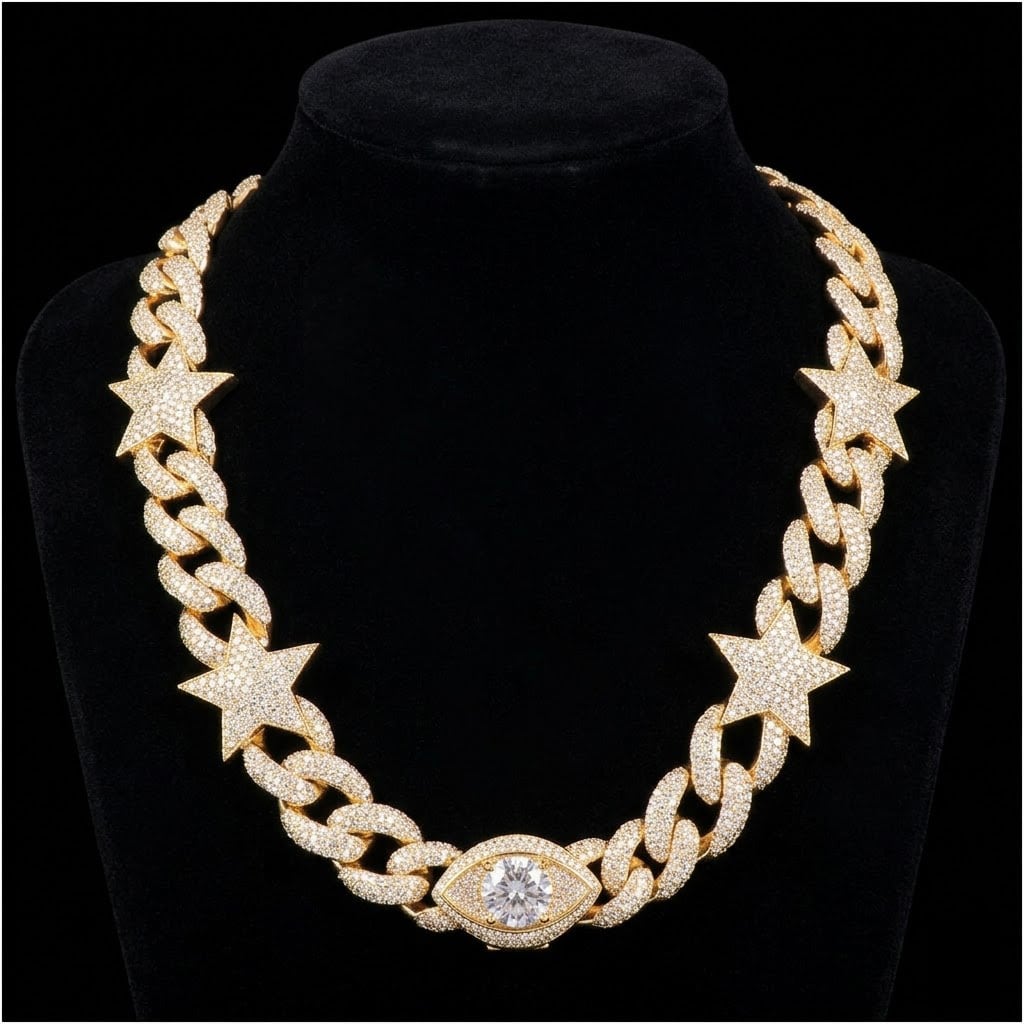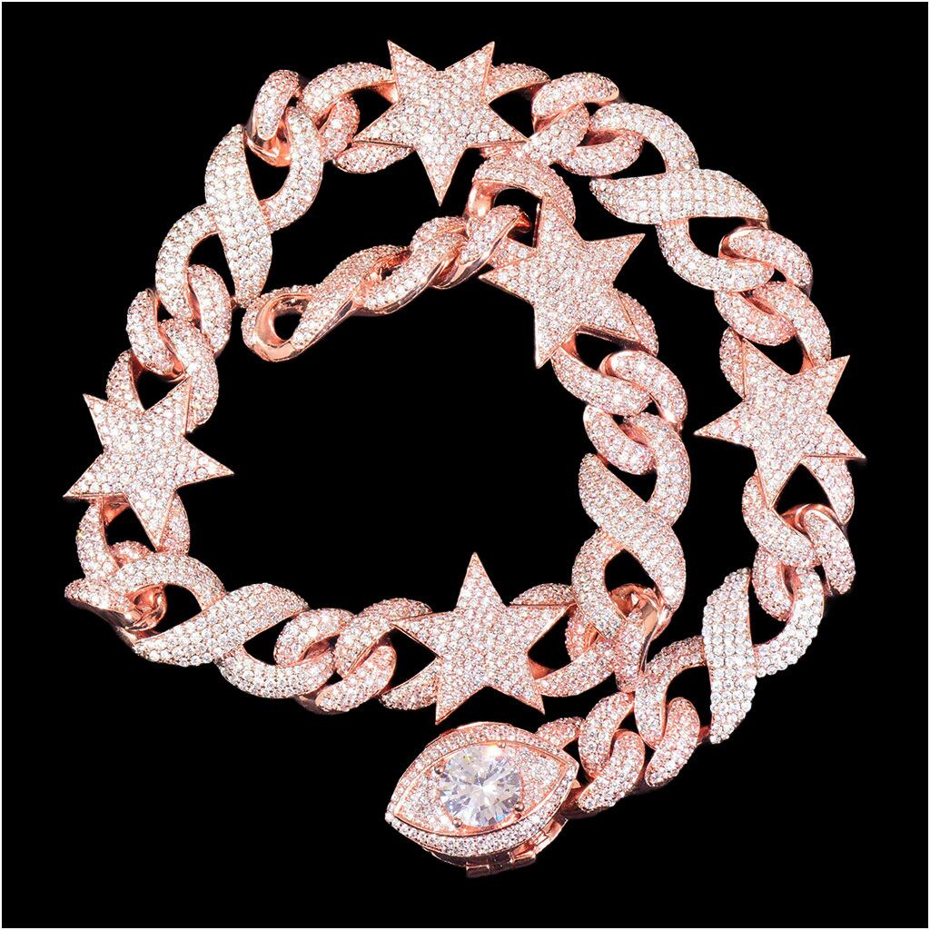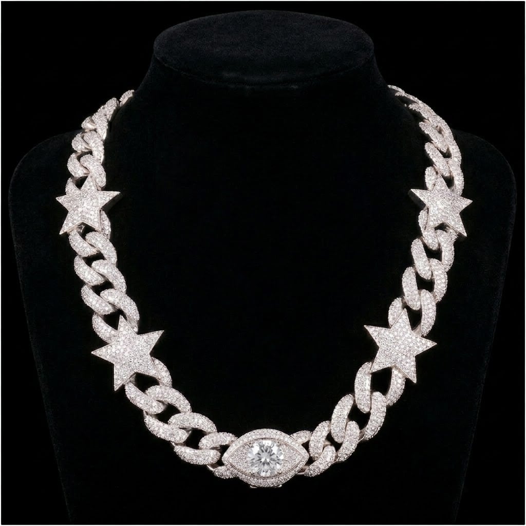 重厚感のあるキューバンチェーンに、スターモチーフを組み合わせたデザイン性の高いネックレス。さらに、アイキャッチとなる大粒ストーン付きペンダントを加えることで、よりラグジュアリーでインパクトのある仕上がりになっています。全面に施されたストーンが光を反射し、どの角度から見ても輝きを放つ存在感抜群のアイテムです。