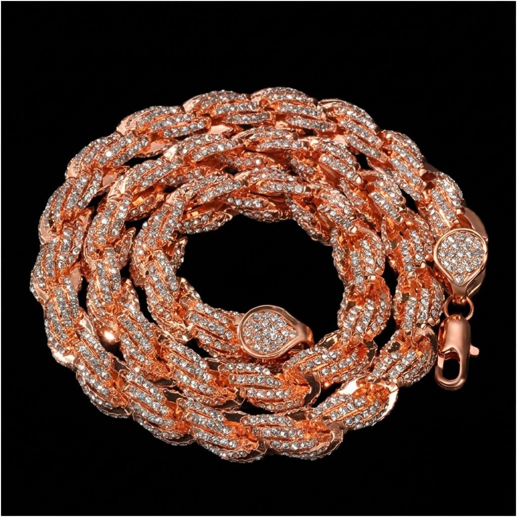 立体感のあるキューバンチェーンに、細部まで丁寧にストーンをセッティングしたフルアイスデザイン。リンク一つひとつに高密度でストーンが施されており、どの角度から見ても隙のない輝きを放ちます。シンプルながらも圧倒的な存在感を持ち、コーディネートを一気に格上げするアイテムです。
