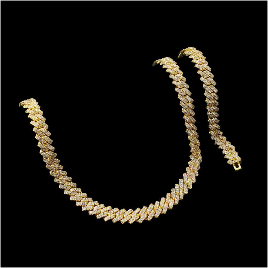 キューバンチェーンをベースに、リンク一つひとつにストーンを贅沢に敷き詰めたフルアイスデザイン。さらにダブルライン構造のように見える独自のリンク形状により、奥行きとボリューム感を強調し、より高級感のある仕上がりとなっております。光を受けるたびに複雑に反射し、圧倒的な輝きを放ちます。